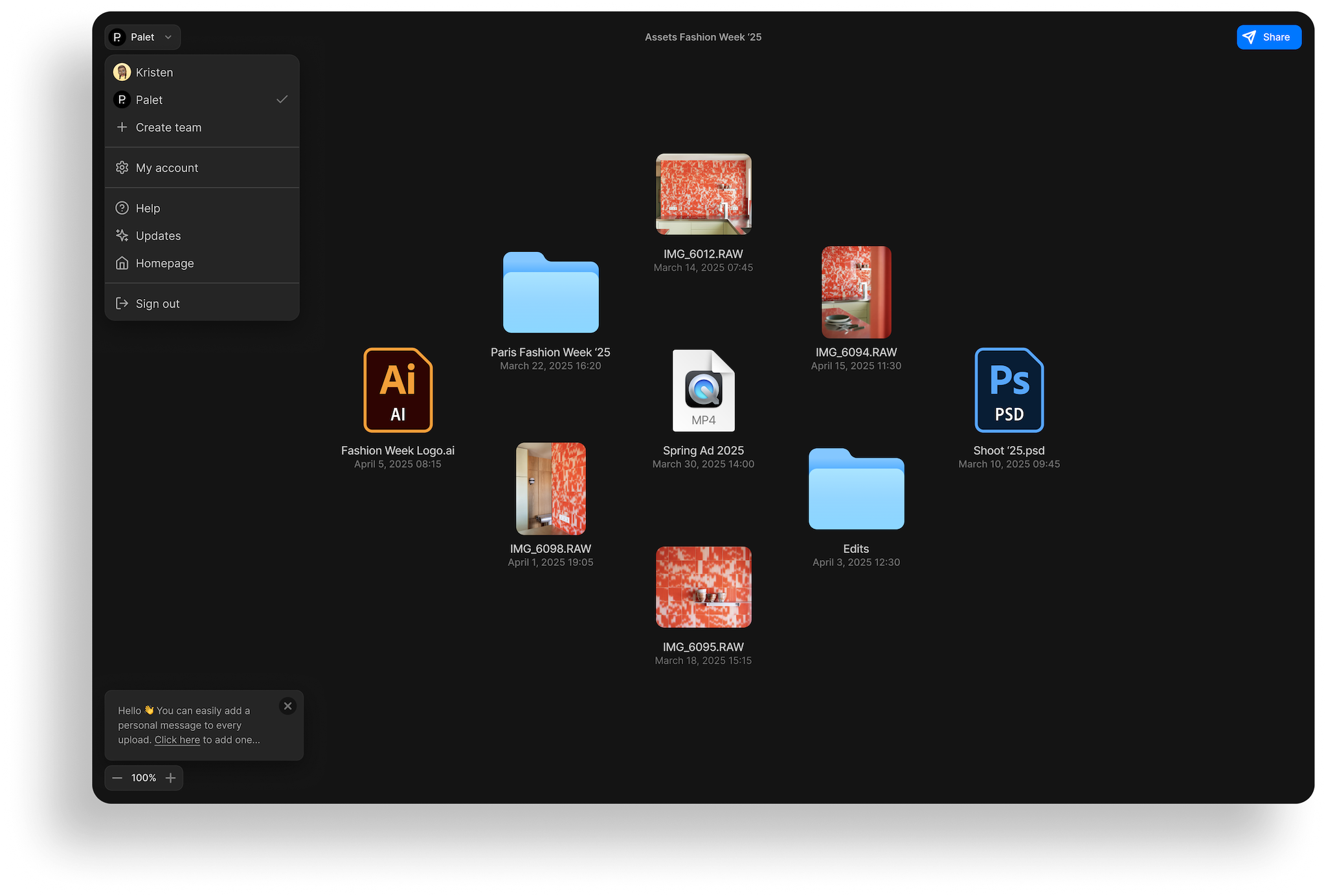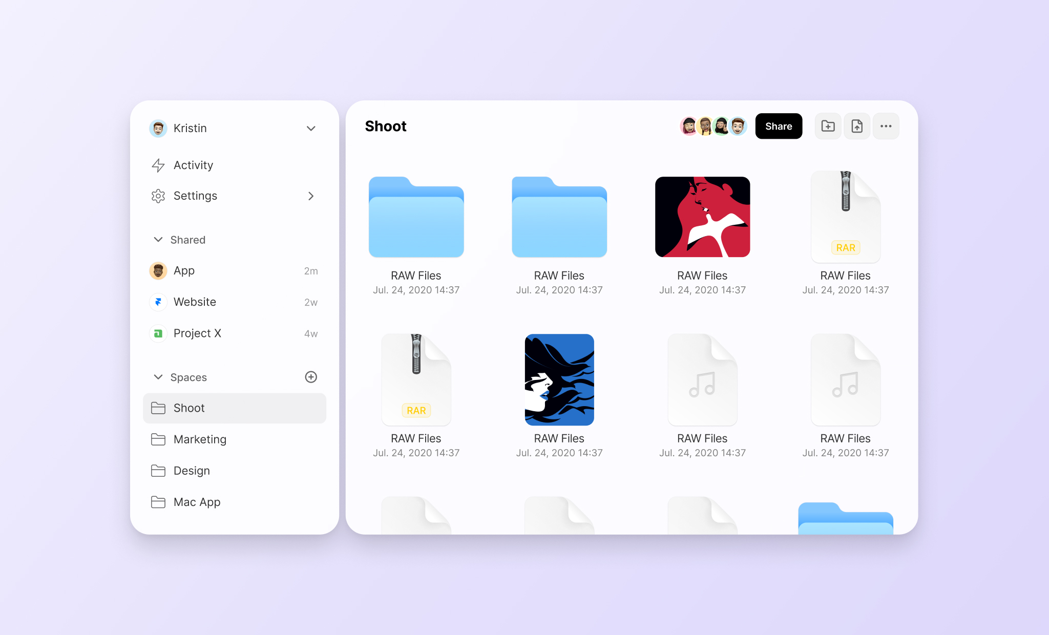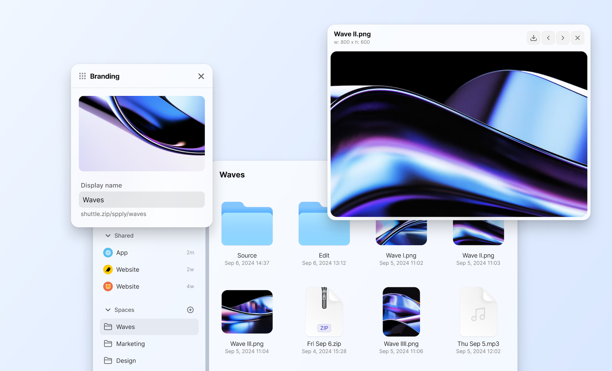 Blob view. Most shared files are limited in number. The blob provide a novel method to display your files, putting your assets front and center. Of course, you can switch to Grid view for larger collections.