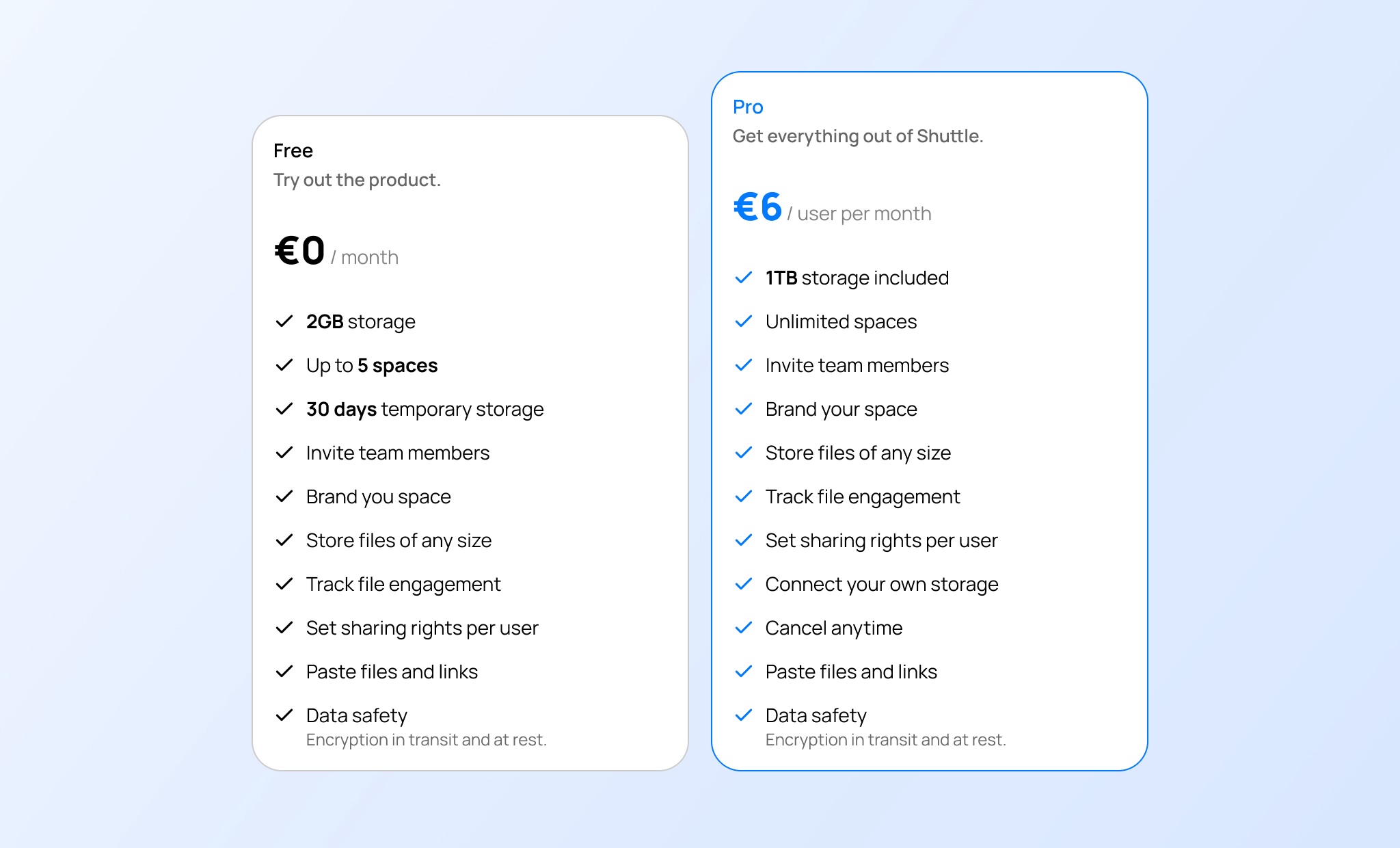Pro: For those who want to get the most out of Shuttle, our Pro plan is available for just €6 per month. This plan offers 1TB of storage, unlimited spaces, all the features of the Free plan and more.
